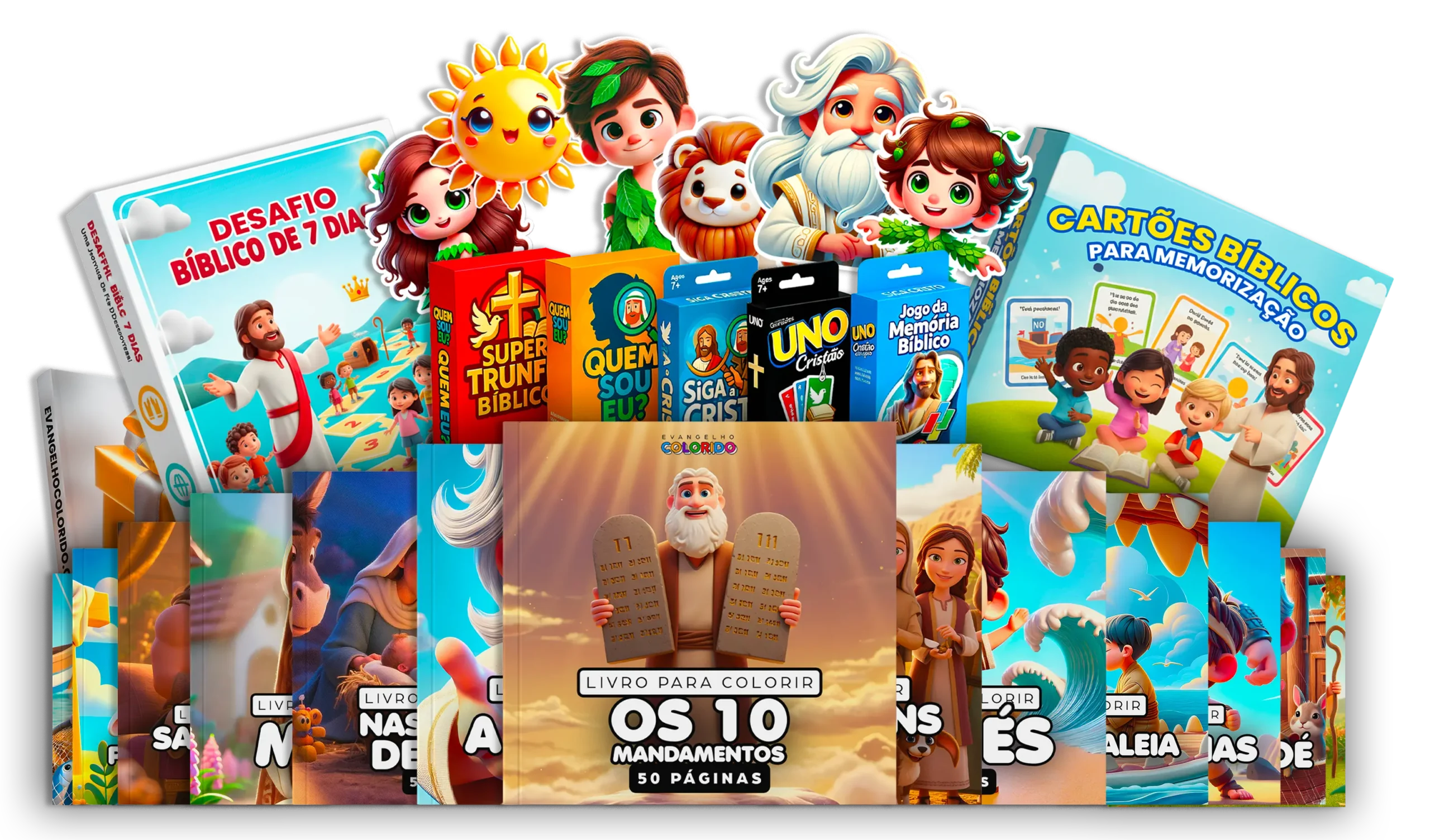 Saia do improviso e afaste as crianças das telas com mais de 25 livros de colorir, jogos e desafios bíblicos prontos para sua família ou ministério.